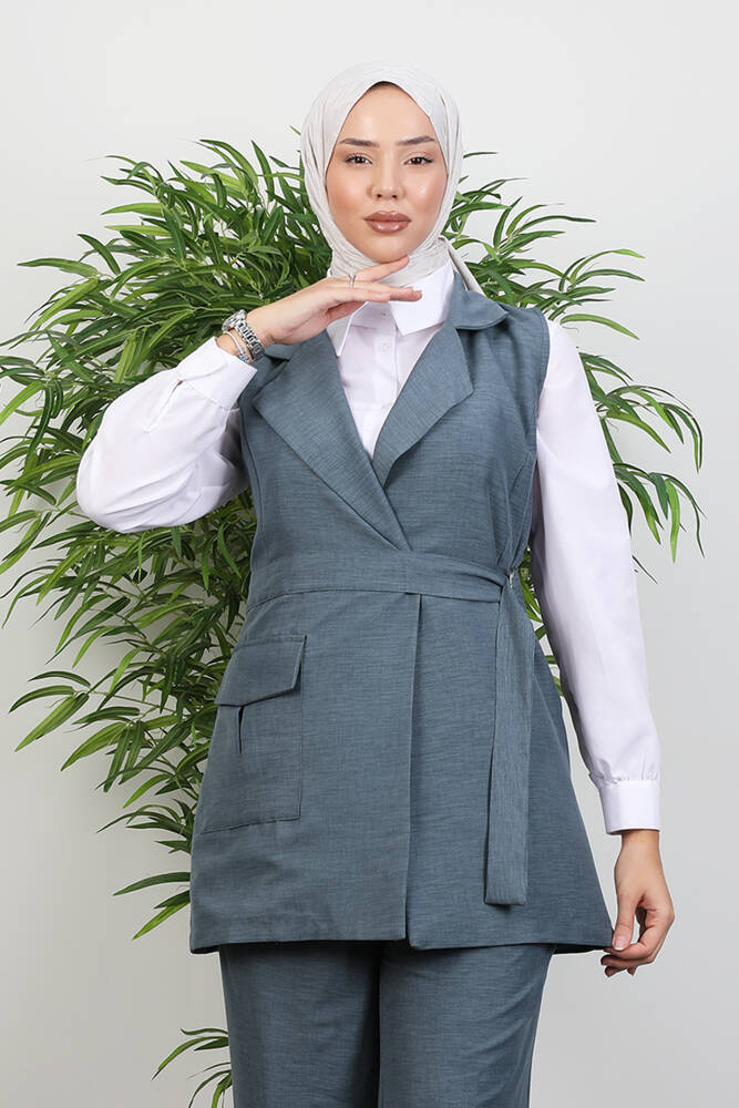 Tek Cepli Kruvaze Yaka Takım Gri Mavi