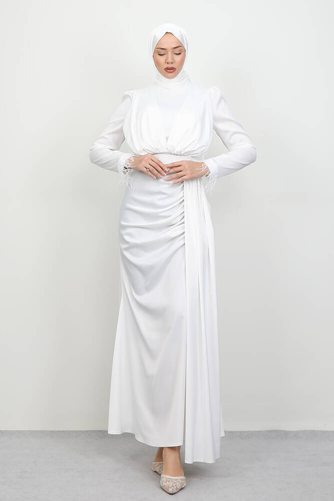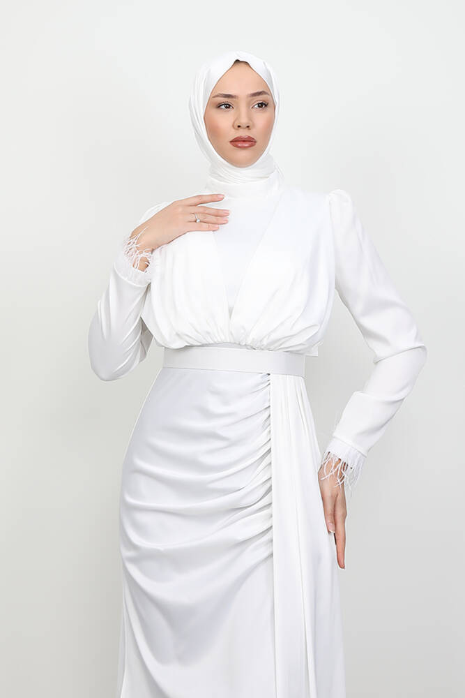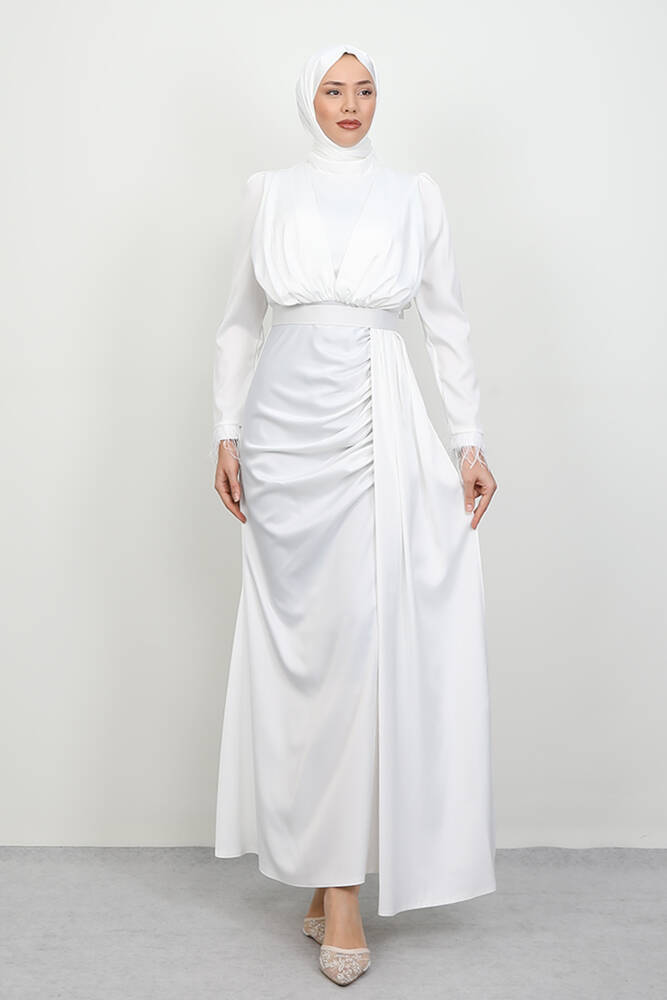 Tüylü Saten Tesettür Elbise Beyaz