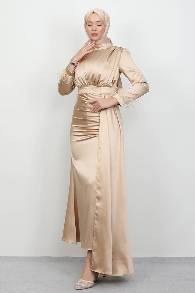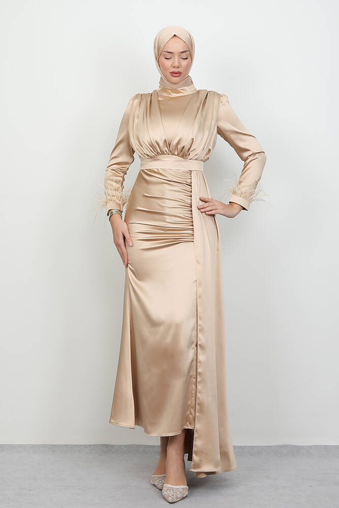 Tüylü Saten Tesettür Elbise Gold
