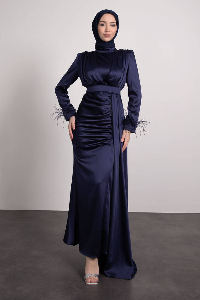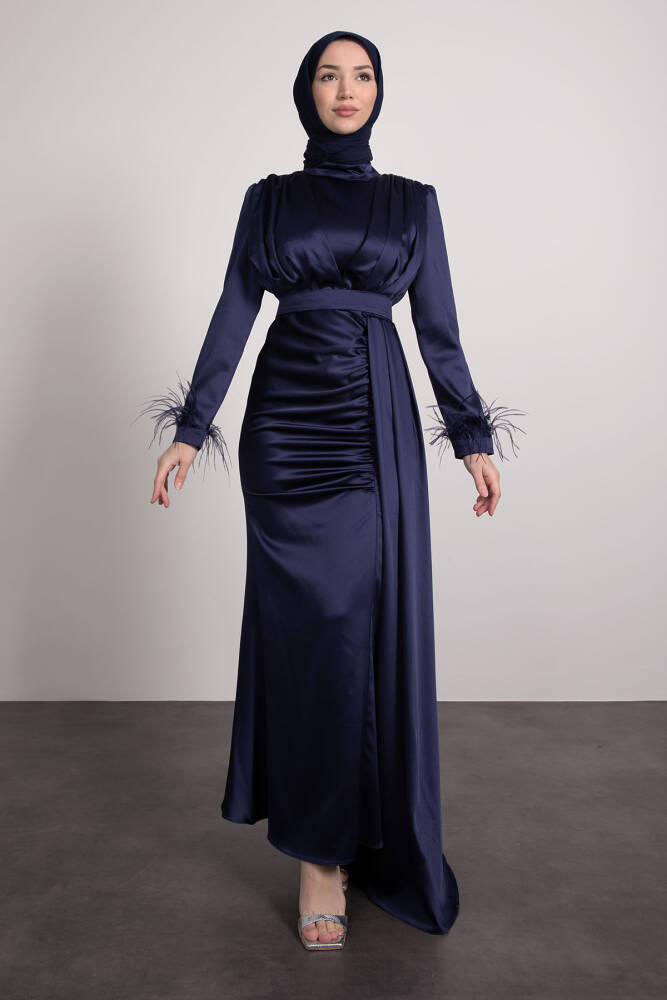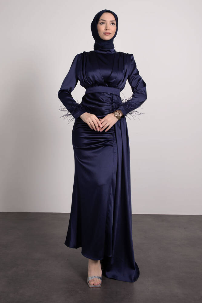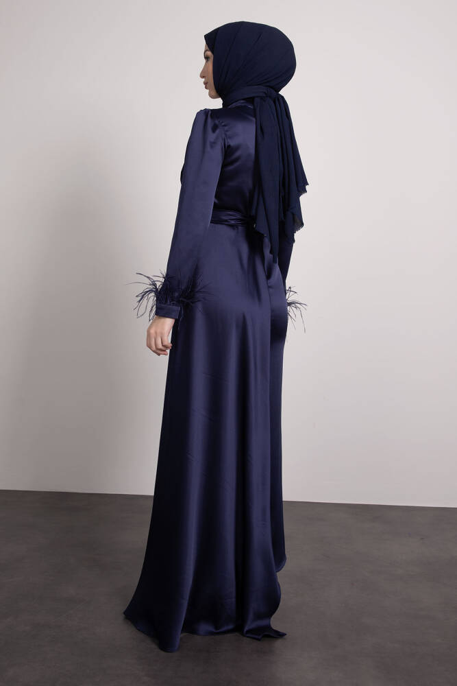 Tüylü Saten Tesettür Elbise Lacivert