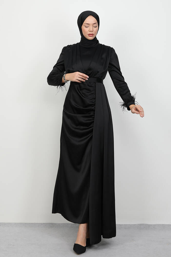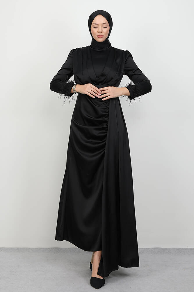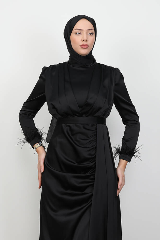 Tüylü Saten Tesettür Elbise Siyah