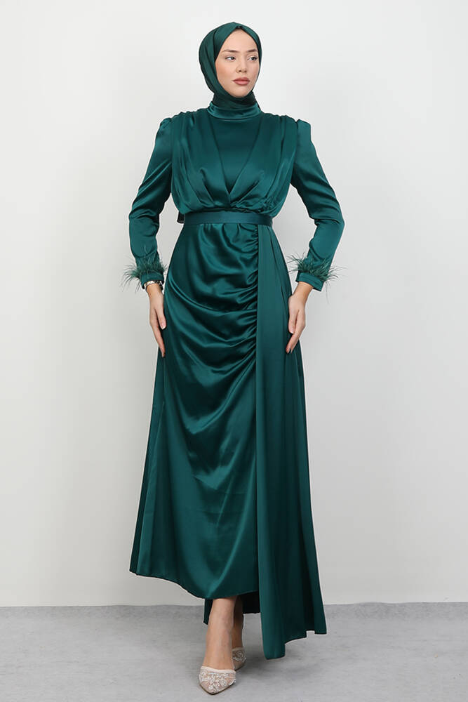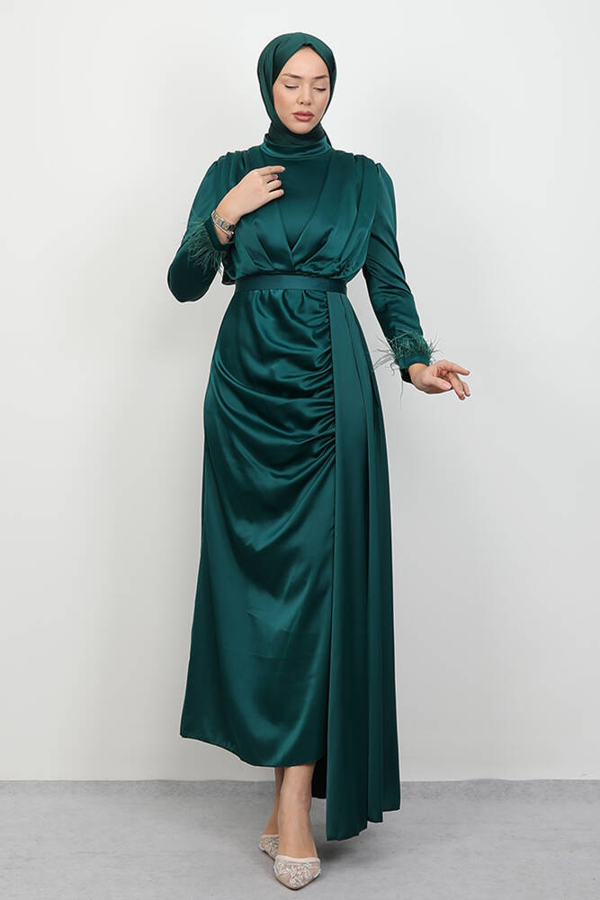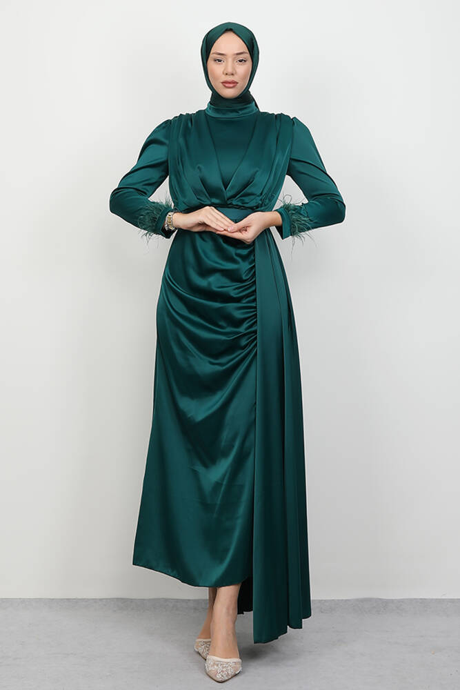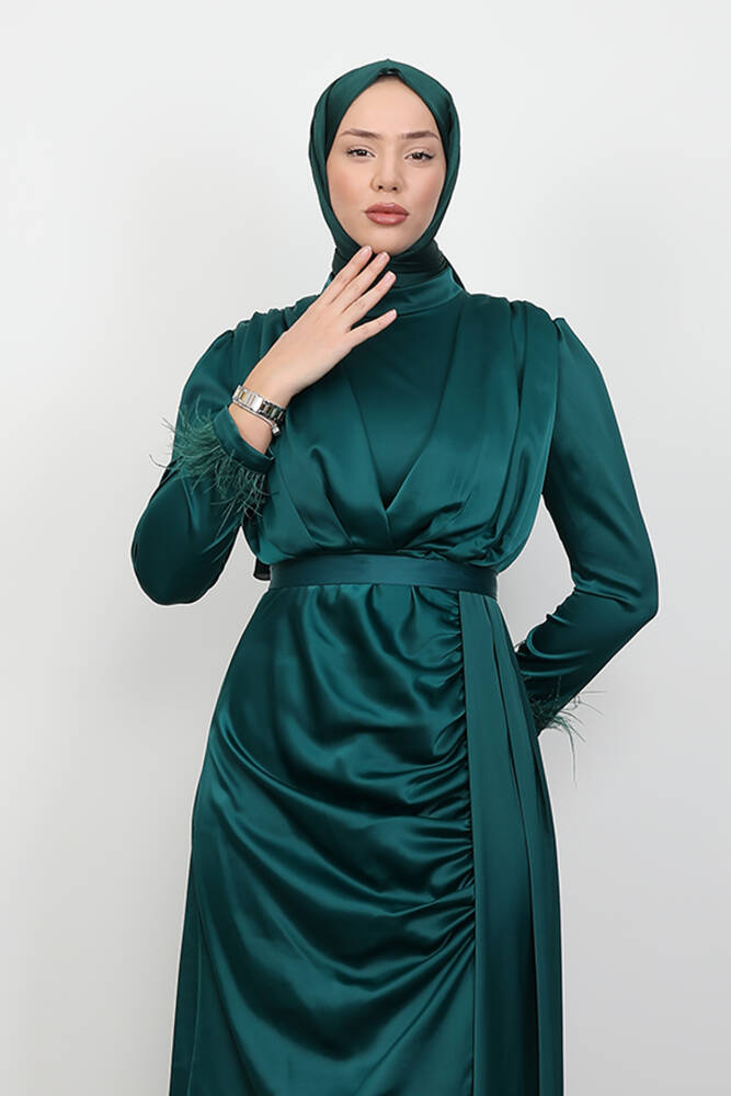 Tüylü Saten Tesettür Elbise Zümrüt
