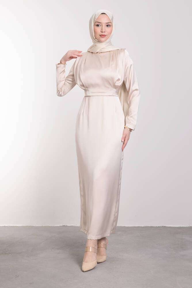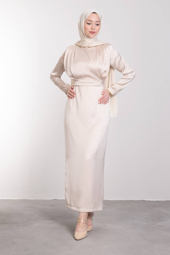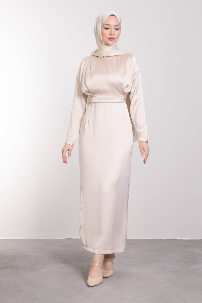Üstü Dökümlü Bele Oturan Elbise Krem
