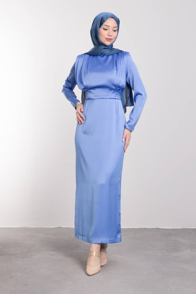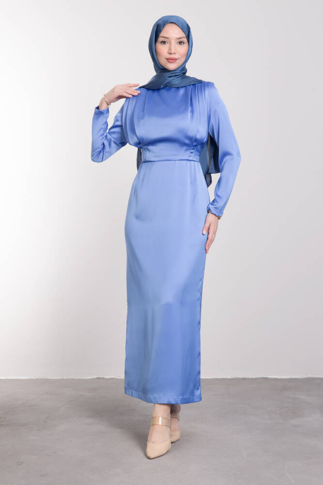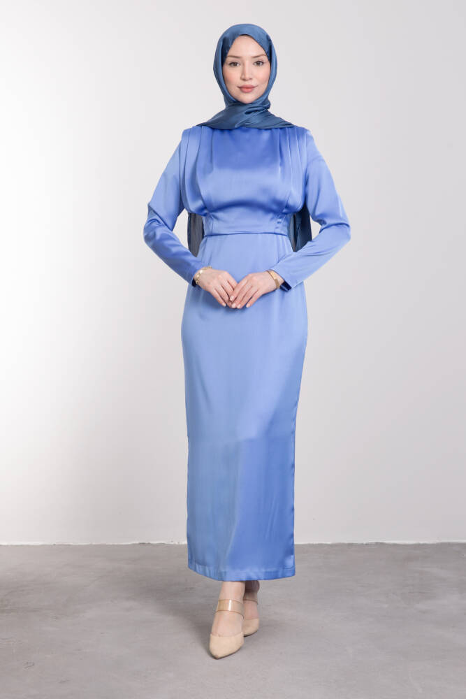 Üstü Dökümlü Bele Oturan Elbise Mavi