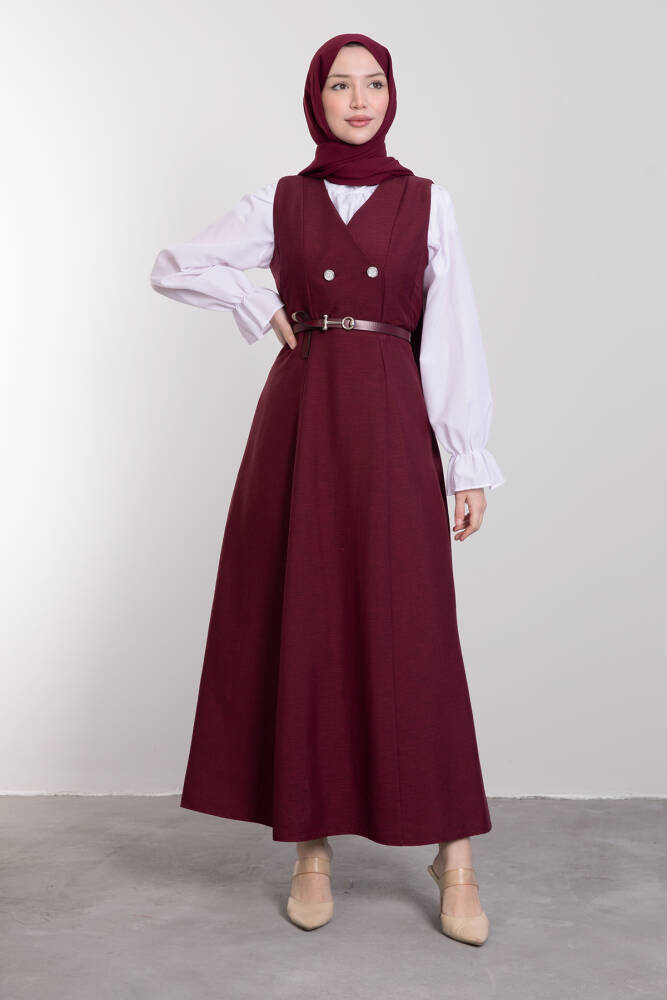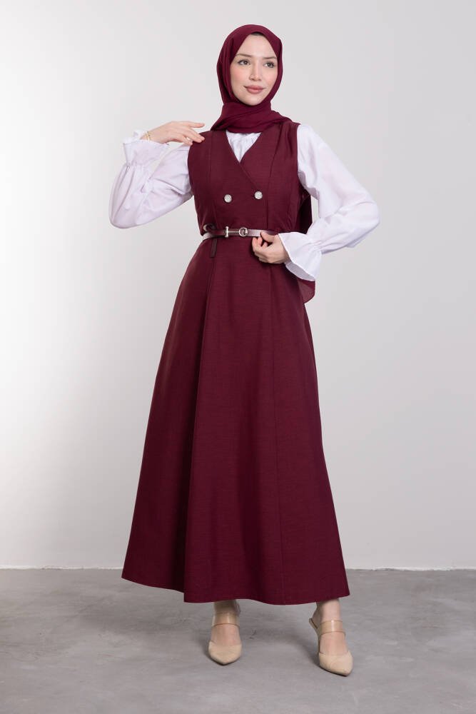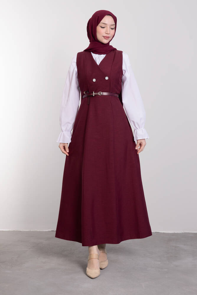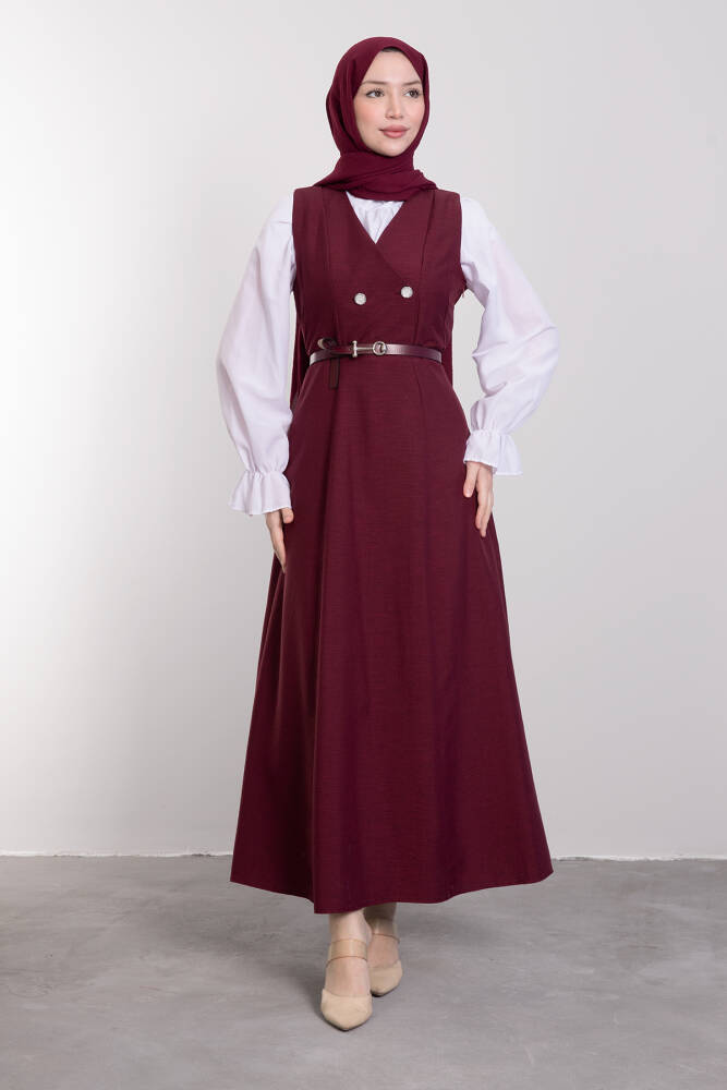 Yakası V Düğmeli Kemerli Elbise Bordo
