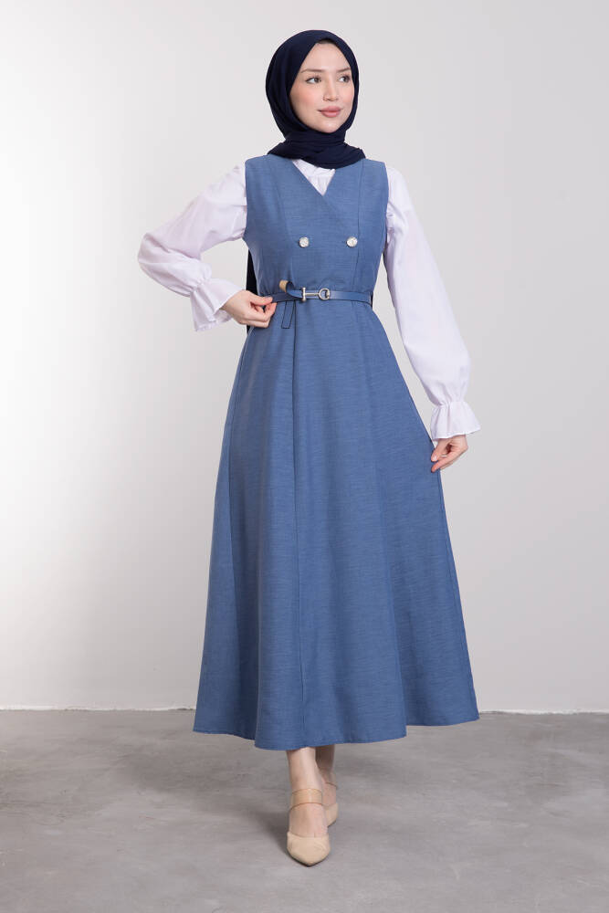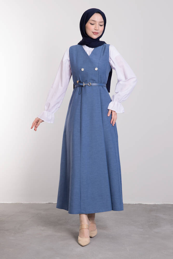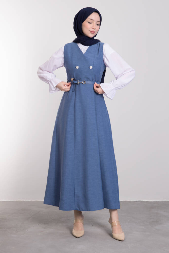 Yakası V Düğmeli Kemerli Elbise İndigo