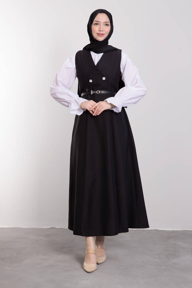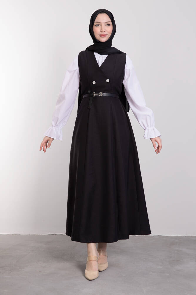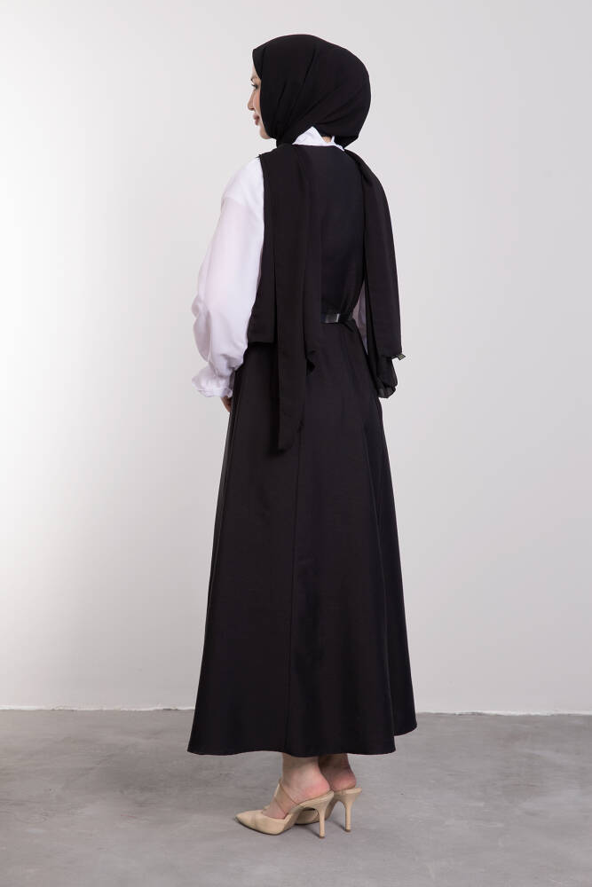 Yakası V Düğmeli Kemerli Elbise Siyah