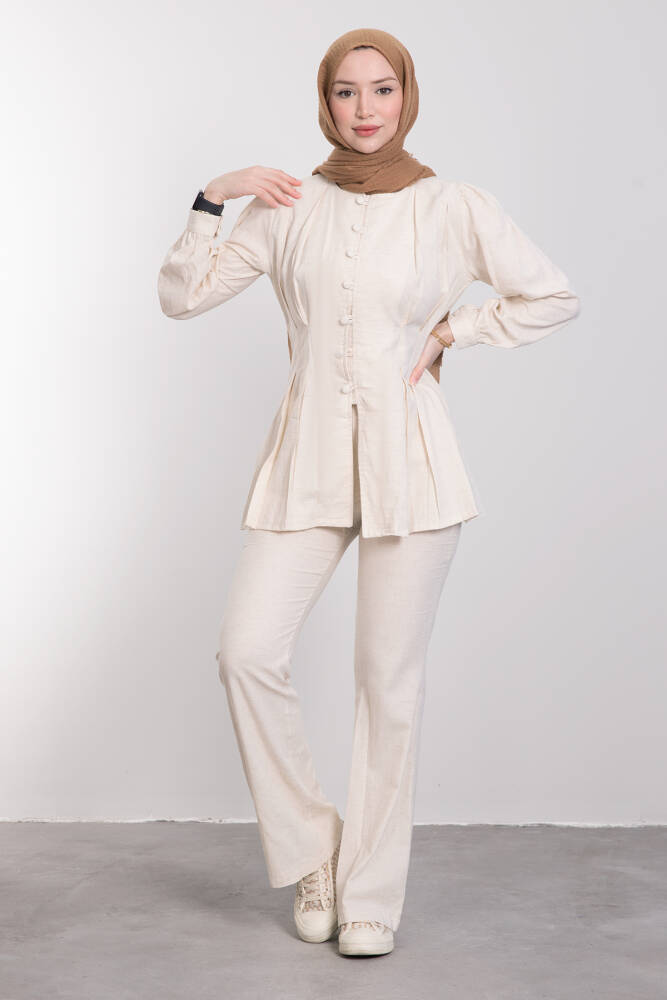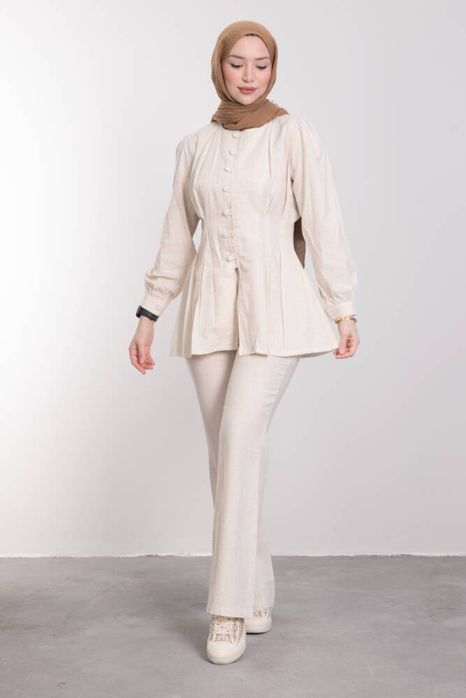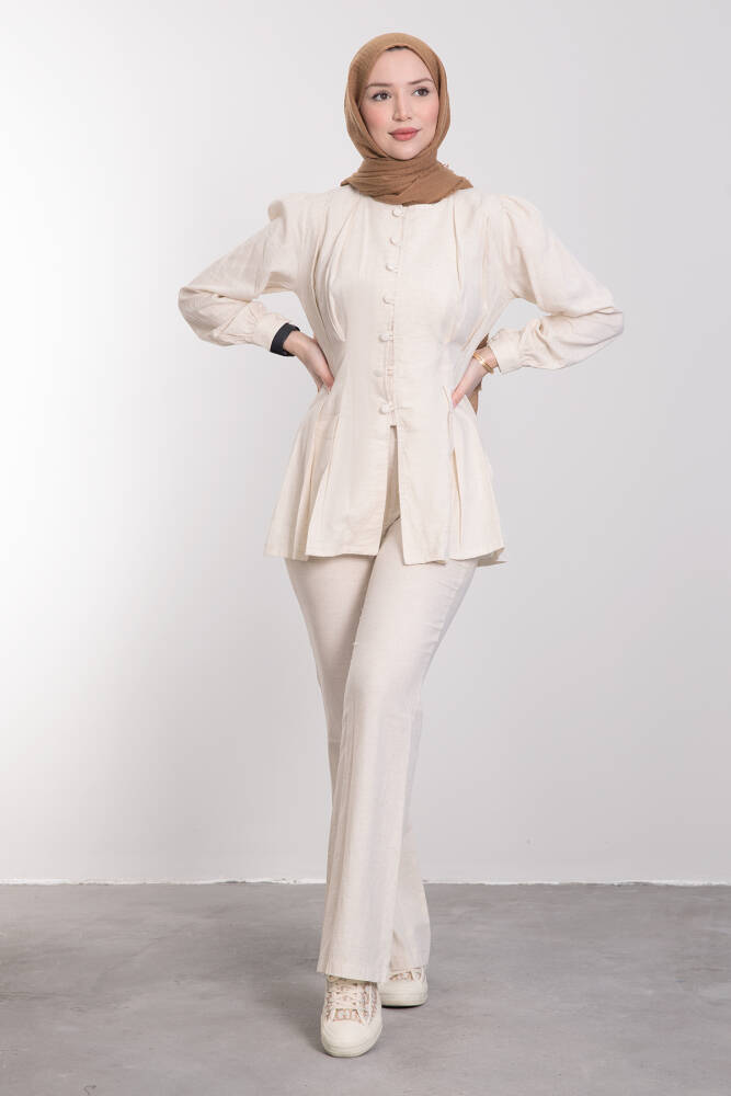 Yanları Pilise Dikişli Mini Düğmeli Takım Krem