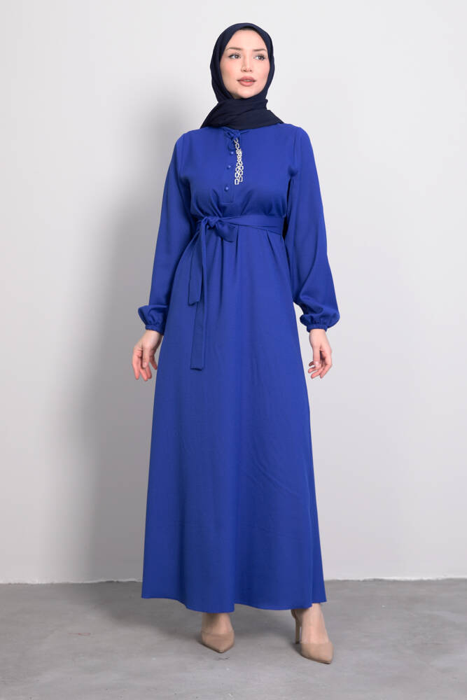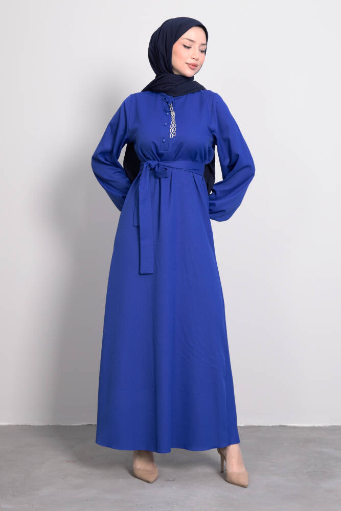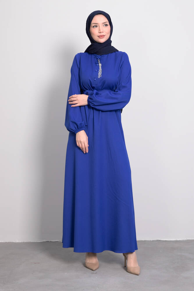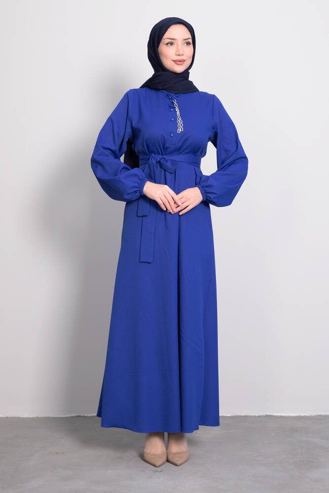 Zincir Düğme Detay Elbise Saks