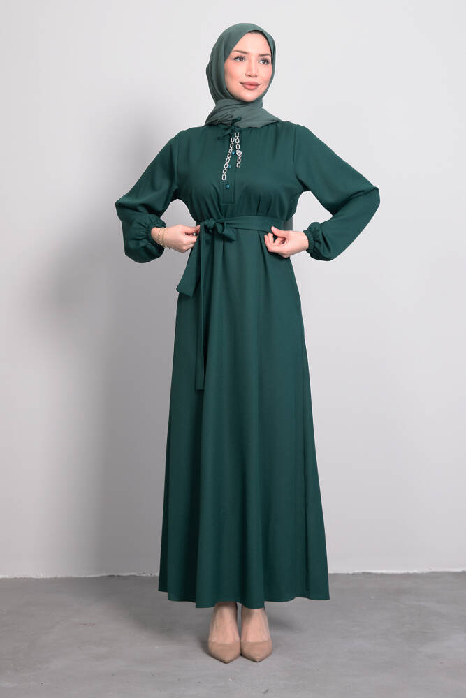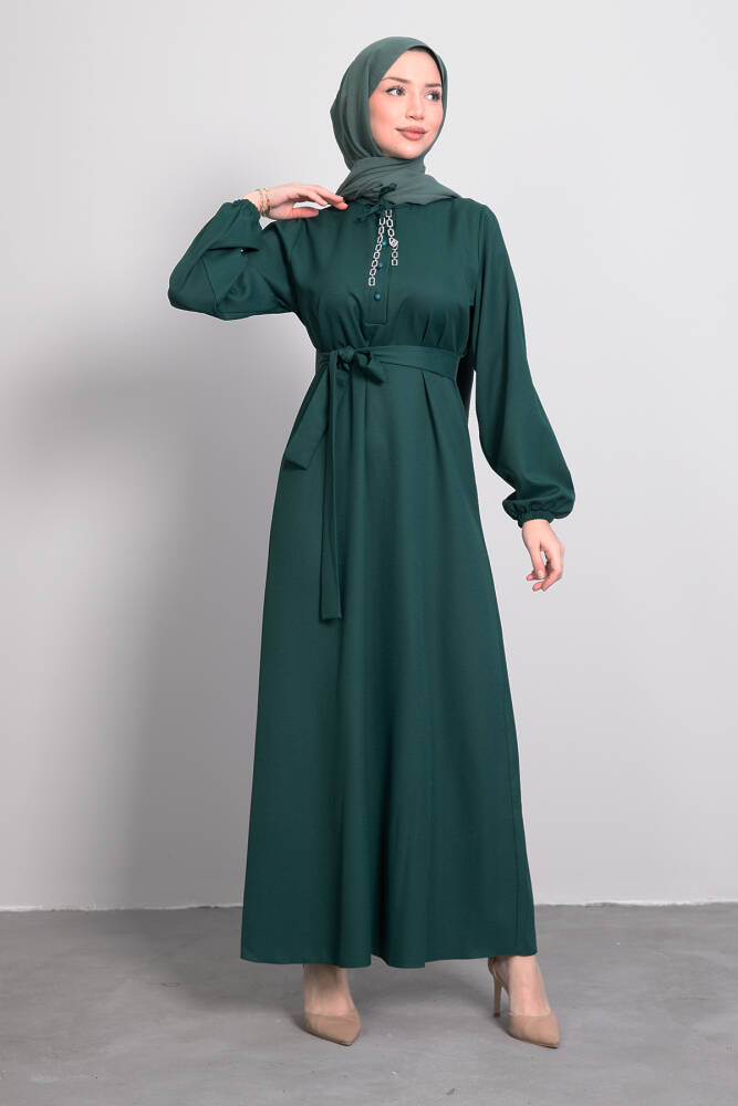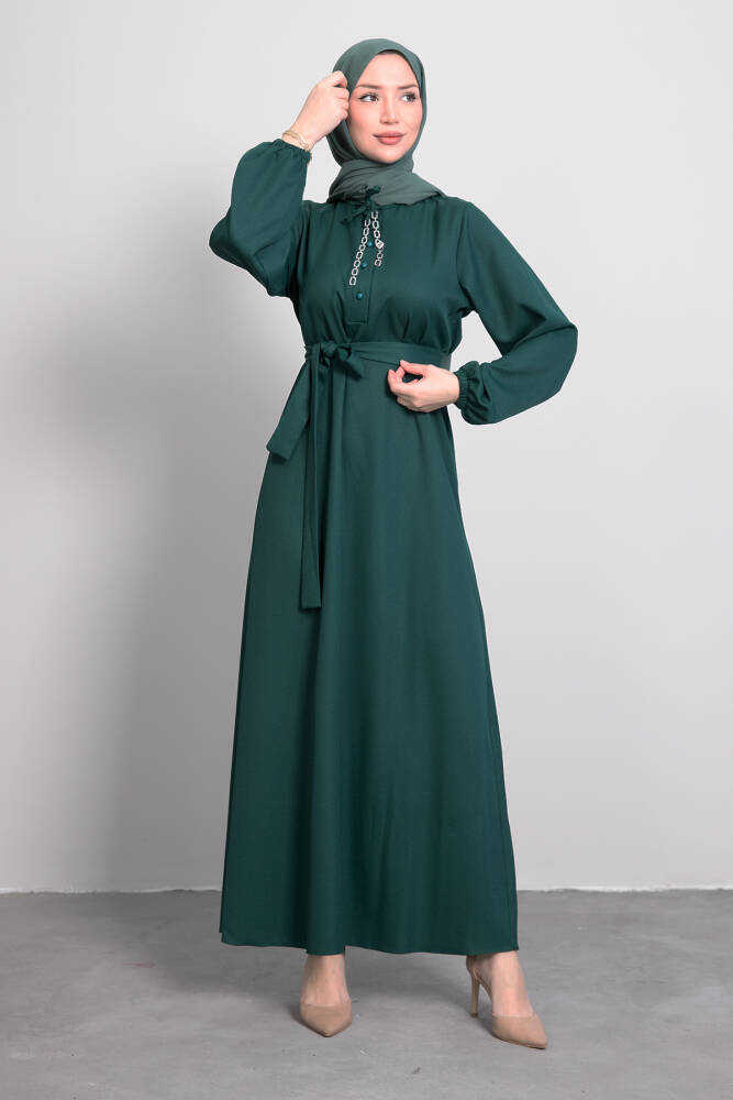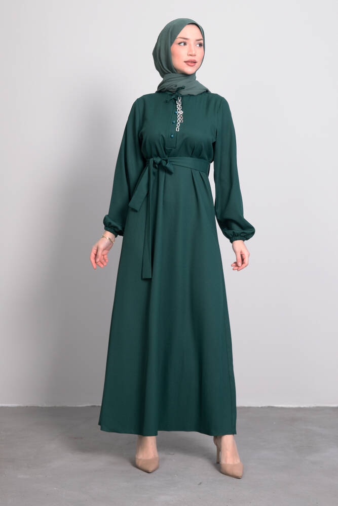 Zincir Düğme Detay Elbise Zümrüt
