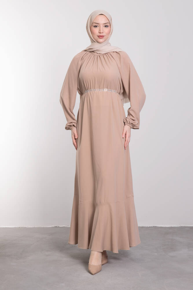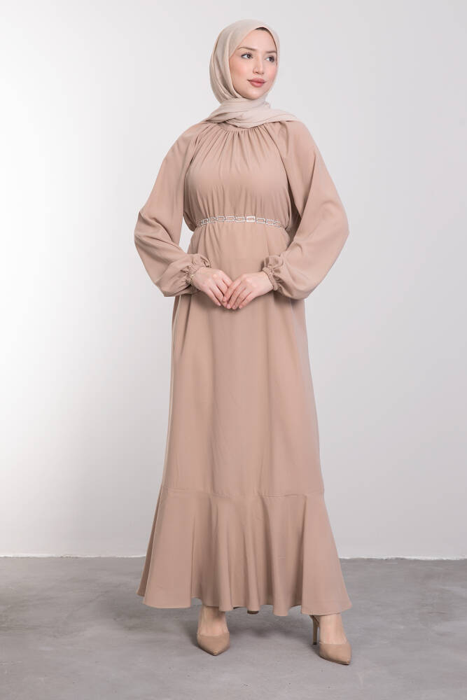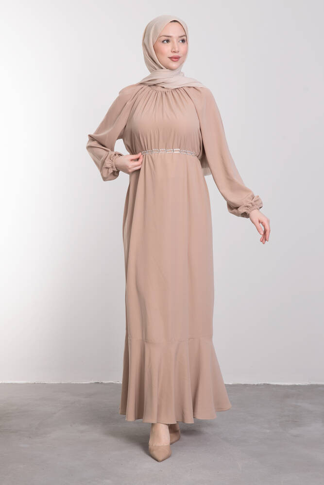 Zincir Kuşaklı Tesettür Elbise Bej