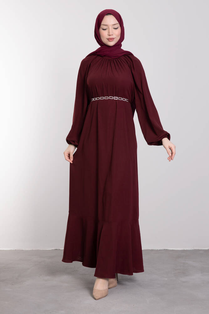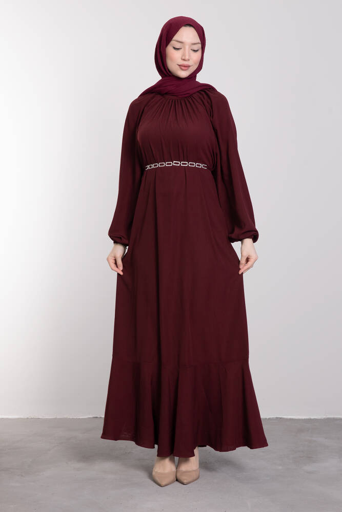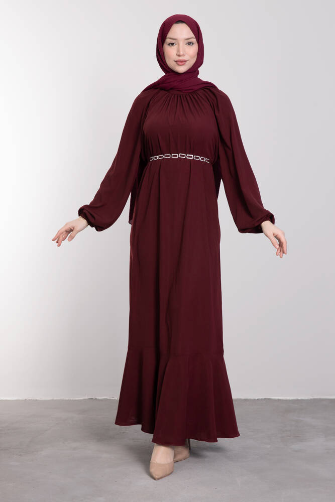 Zincir Kuşaklı Tesettür Elbise Koyu Bordo