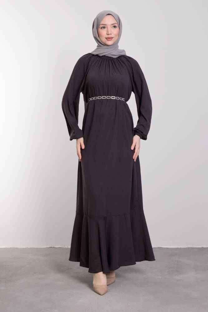 Zincir Kuşaklı Tesettür Elbise Koyu Gri