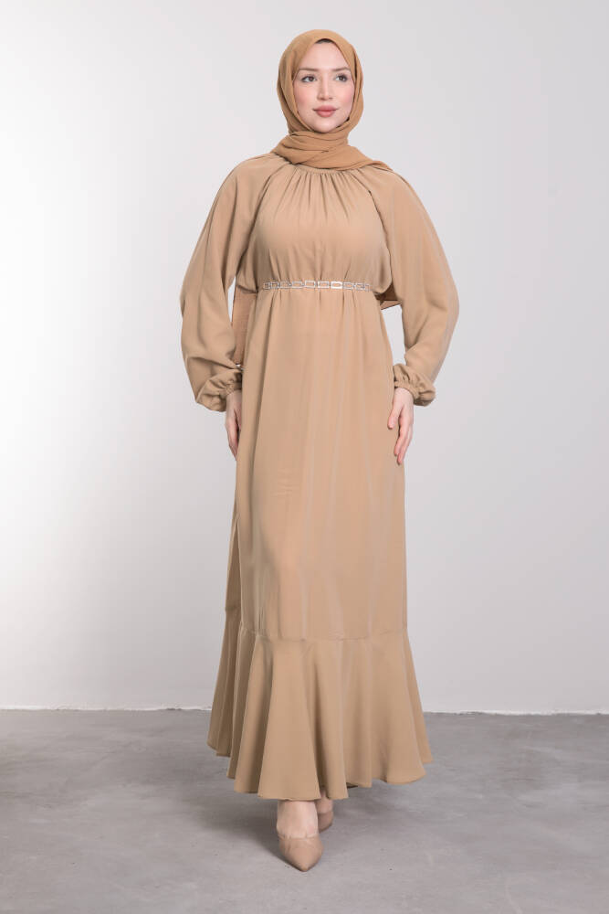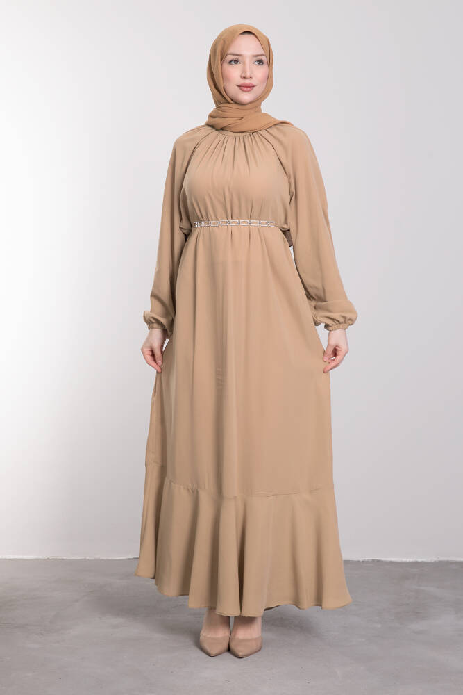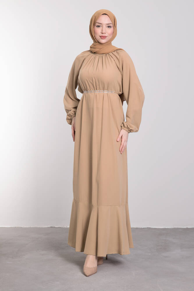 Zincir Kuşaklı Tesettür Elbise Sütlükahve