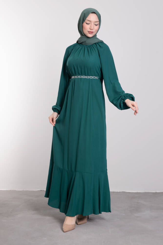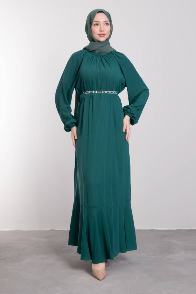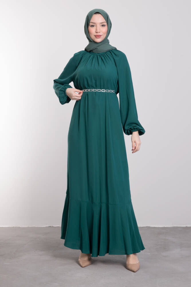 Zincir Kuşaklı Tesettür Elbise Zümrüt